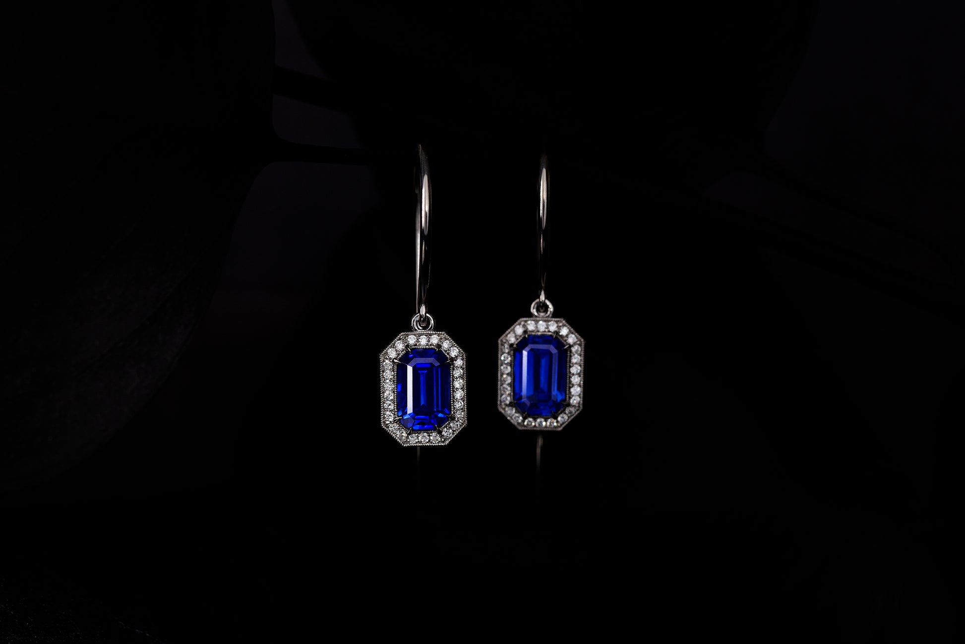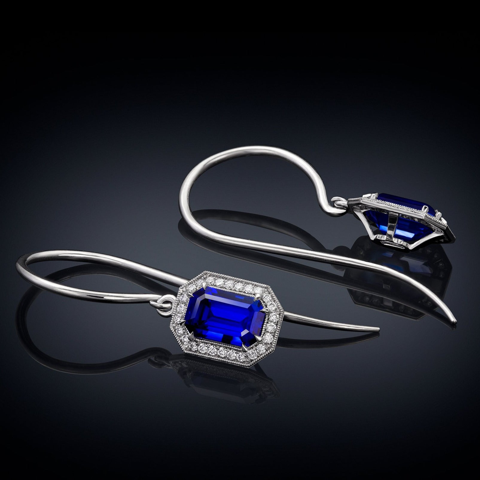 These classic drop earrings are hand made in platinum featuring a matched pair of 1.45ctw emerald cut blue sapphires from SriLanka. They are surrounded by beautifully cut F-G color VS clarity Diamonds. These Earrings have been completely fabricated by hand, are accompanied by an appraisal and include a coffee table book revealing the step-by-step process of how they were made.