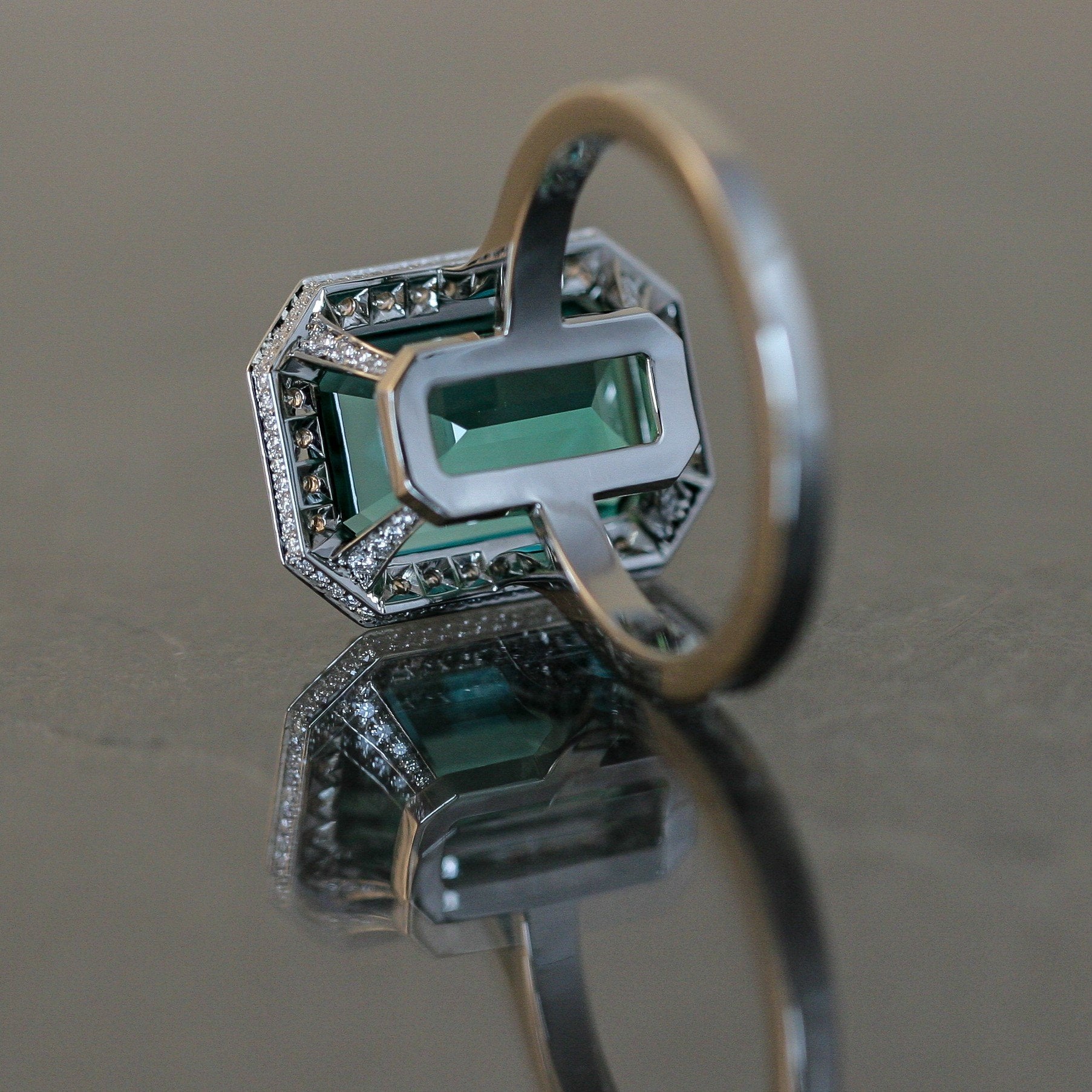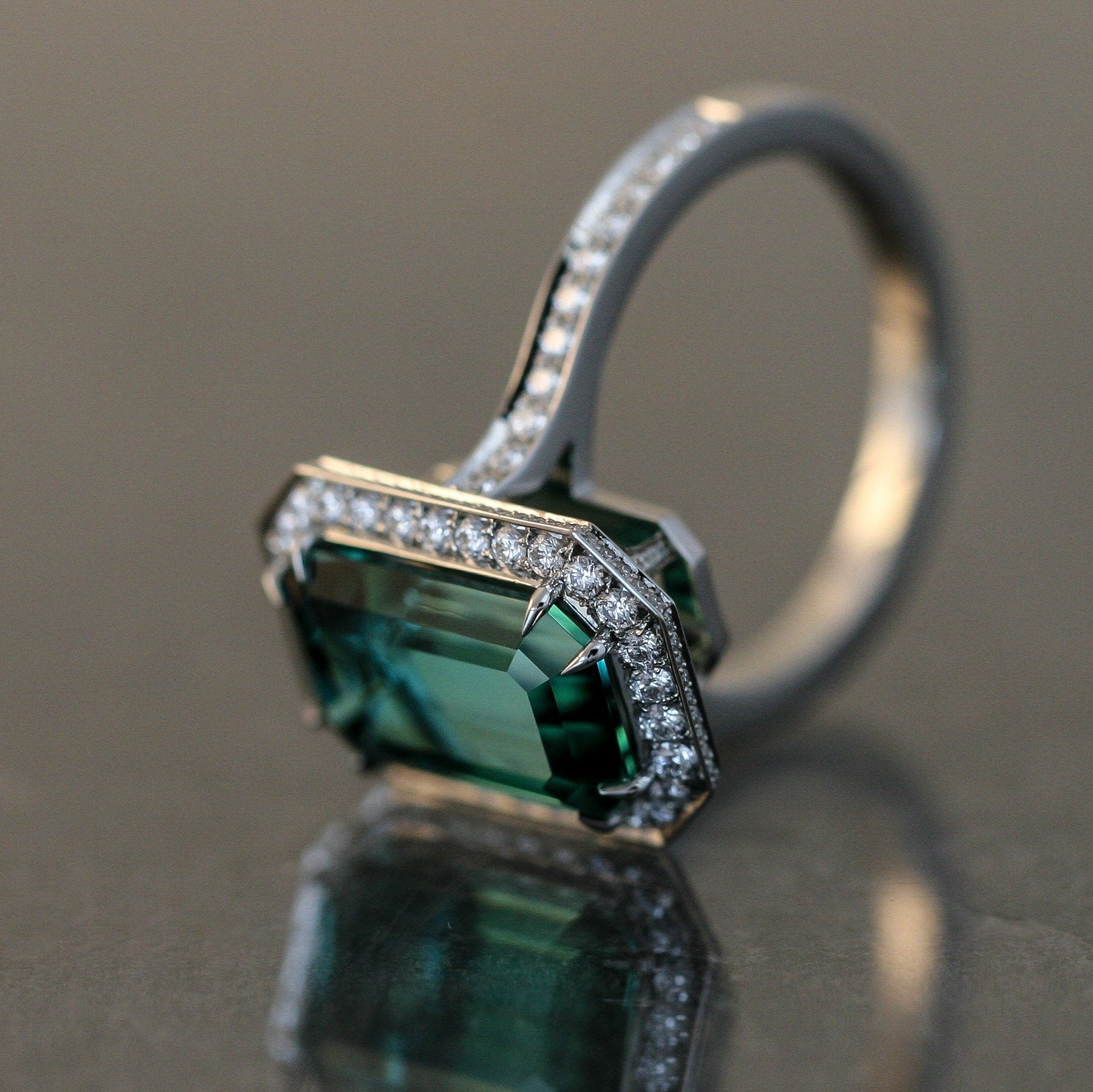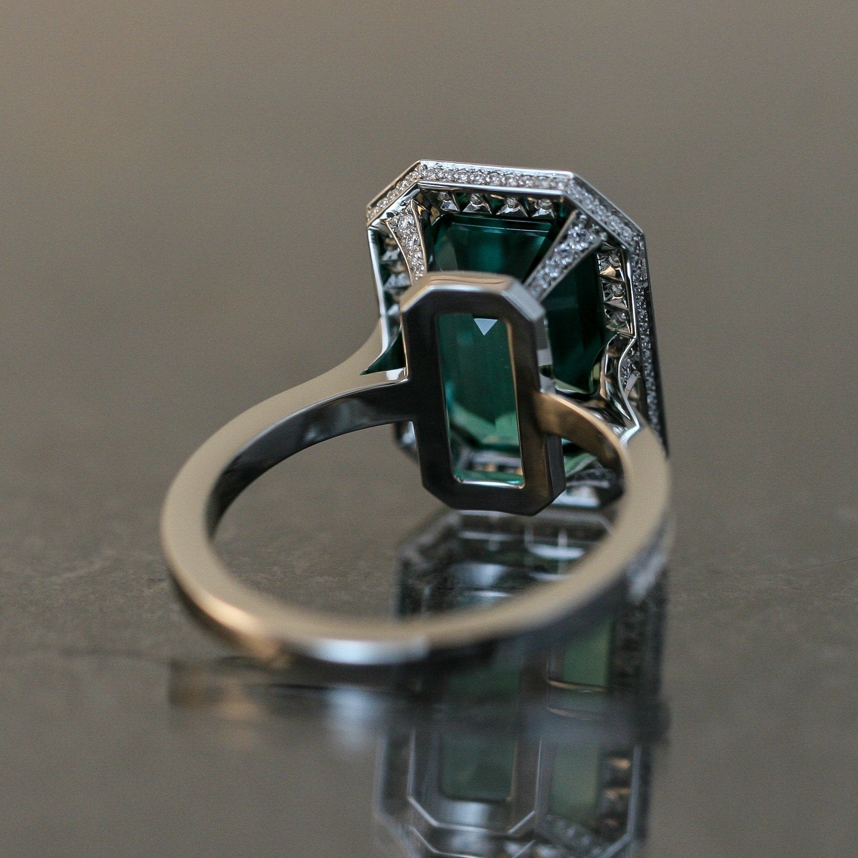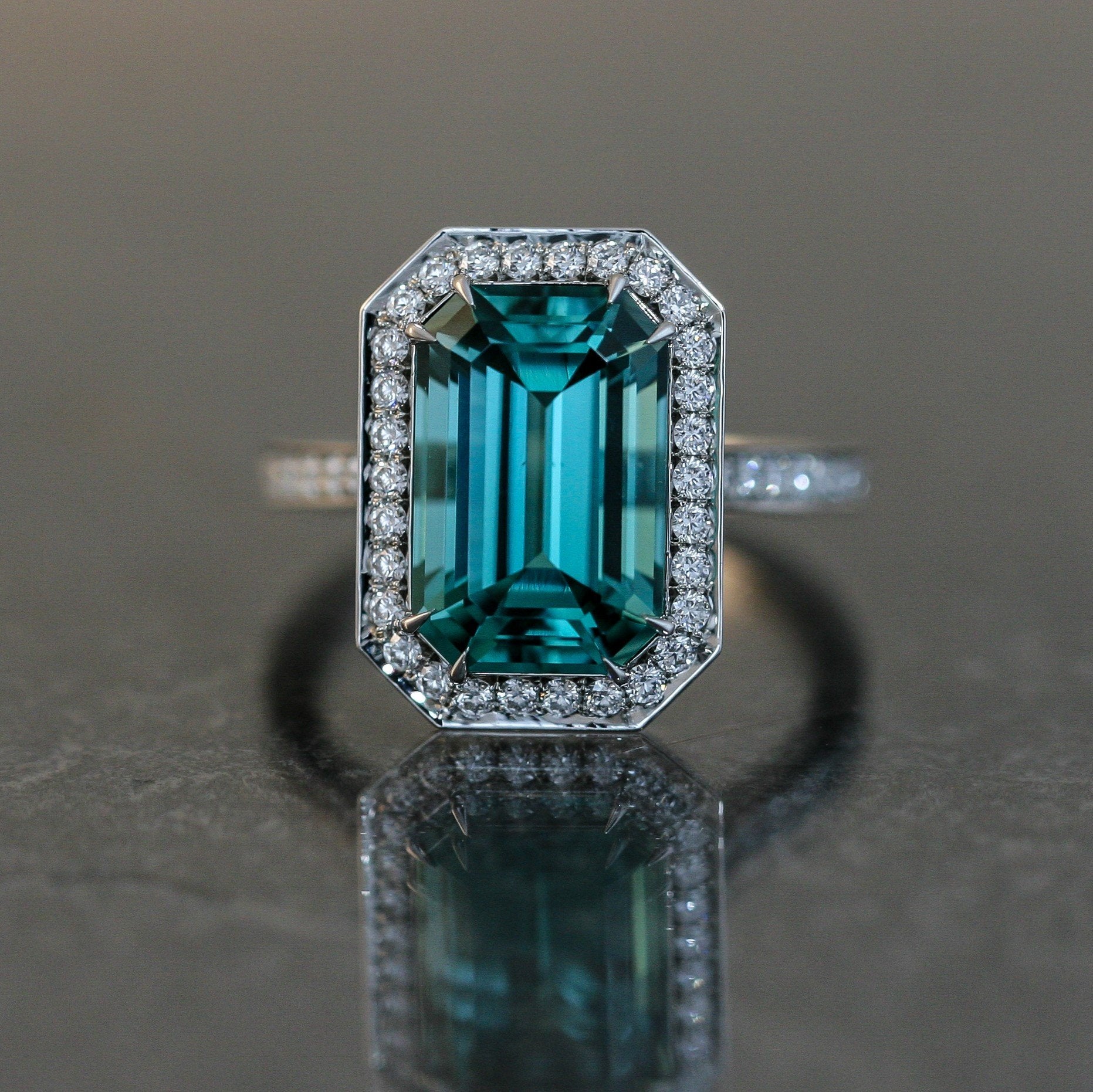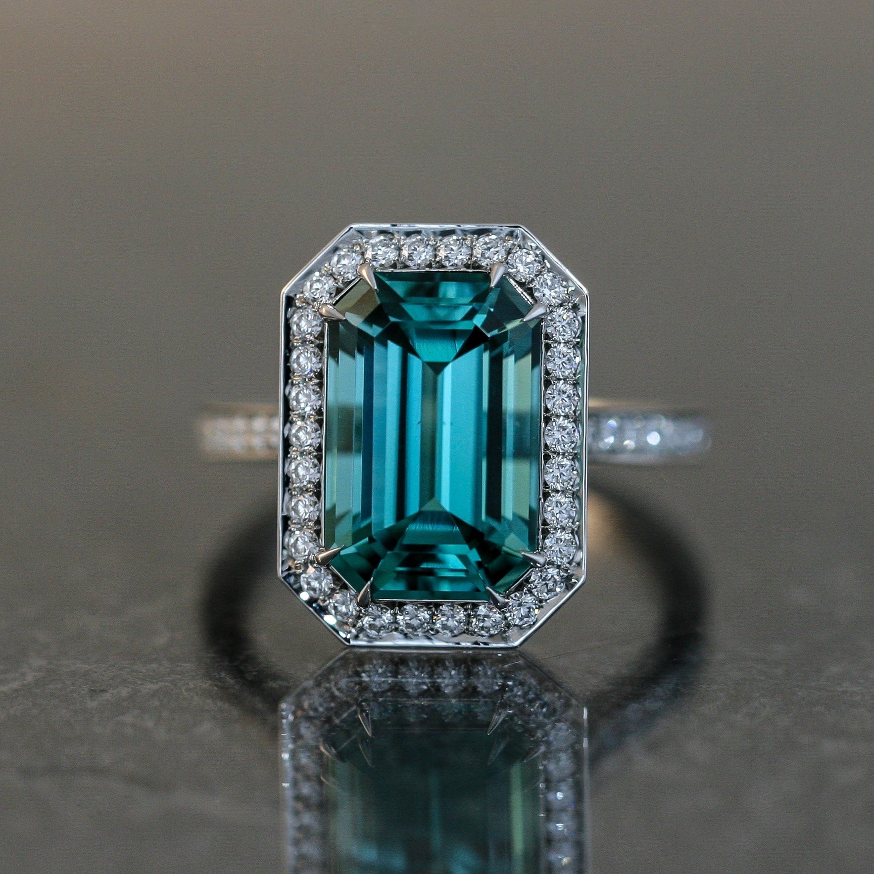 "Lagoon Blue" is a Hand Fabricated Platinum Ring Featuring a 5.57ct emerald-cut lagoon tourmaline from Namibia accented in a halo of D-F VS ideal-cut Diamonds.